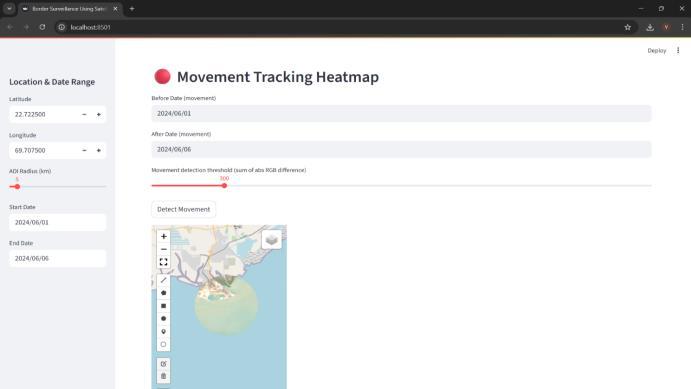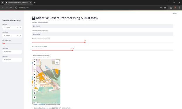 The system successfully identifies high-change zones, structuralmodifications,duststorms,humanfootprints,and container layouts. Predictive models highlight risk probabilitiesrangingfromlowtocriticalbasedonmovement, vegetation,andenvironmentalvariables.