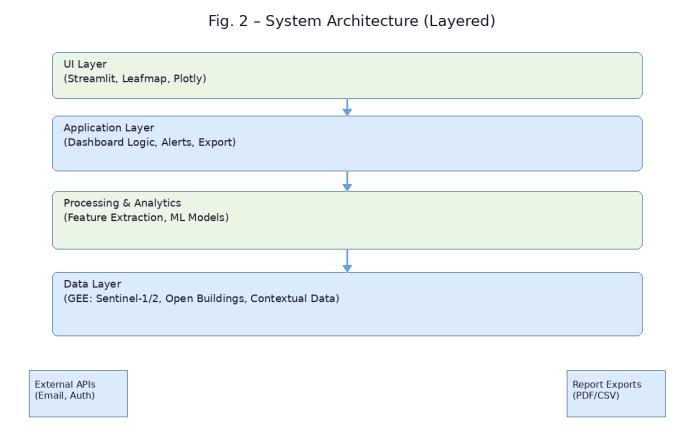 ThesystemisdevelopedinPython3.10withStreamlitasthe dashboard framework. Google Earth Engine API handles satelliteimageryprocessing,whileLeafmap/Geemaprender maps. Additional libraries include scikit-learn for model training, Plotly for graph visualization, and Folium for geospatiallayers.