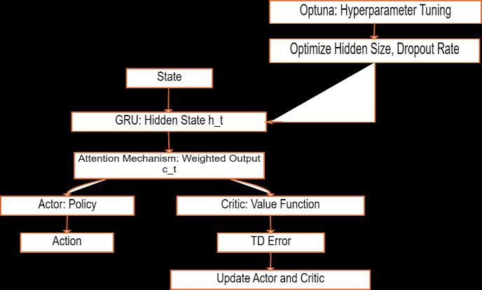 Training Parameters Episodes:300episodesperexperiment. Learning Rate: 0.001, optimized using the Adam optimizer. Hidden Size: Tuned using Optuna hyperparameter optimization. Dropout Rate: 0.1 to prevent overfitting. Device: CUDAenabled GPU for accelerated computation(TestedwithCPUonly).