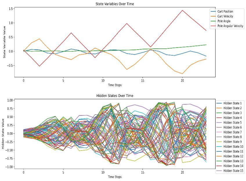 The eXActor-Critic framework captures and interprets modeldynamics,offeringinsightsintotheinterplayofstateenvironmentalvariableswithGRUhiddenlayers.Figure7 plotsselectedGRUhiddenlayersandstatevariablesover time,revealingtheirtemporalevolution.ByanalysingGRU hiddenlayerdynamics,theframeworkexamineshowstate variables and hidden layers evolve, including activation function behaviour; whether they saturate, explode, converge,ordivergetoprovideexplanationforsuboptimal performanceordiscoveryofredundantinactivelayer.This interpretability is crucial for understanding temporal dependencies for model optimisation. The insights gained enabletargetedpolicyrefinementandfeatureengineering, enhancinglearningefficiencyandperformance.Inthisway, eXActor-Criticframeworkadvancespolicyoptimizationand interpretability, making it a powerful tool for dynamic environments.