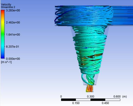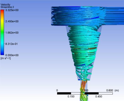Theflowstreamlinewascreatedwith100trackingpointsto obtaintheflowpath.Figure7showstheflowstreamlineina vortexturbinewithandwithouttheadditionofadrafttube. Theadditionofadrafttubetotheoutletbasinchannelcauses achangeinthepathphenomenonofthevortexflowinthe turbinebasin.Thevortexflowafterhittingthebladesonthe turbine without the addition of a draft tube tends to be directedinanaxialdirectionsothattheflowfallsfreelyand exitstowardstheturbineoutletchannel.Thisphenomenon causestheflowstreamlinetobeunevenlydistributedover thevortexturbinerunnerareaandcanaffecttheresulting torque gain. On the other hand, adding a draft tube to the outletbasinchannelcanchangetheflowphenomenonfrom axial flow near the outlet channel to tangential flow. This phenomenoncanbeobservedfromtheflowstreamline.The changeinflowphenomenonduetotheeffectoftheaddition ofadrafttubecausestheflowstreamlinetobemoreevenly