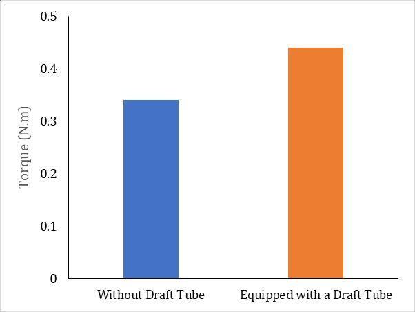 Figure 8 shows the torque of a vortex turbine with and withouttheadditionofadrafttubefromtheCFDsimulation results. The simulation results show that a vortex turbine withtheadditionofadrafttubeattheoutletchannelcauses an increase in the torque value on the turbine runner, a similarfindingwasalsofoundinresearchconductedbyKim etal. (2021).InresearchconductedbyKim etal. (2021)the additionofasmalldrafttubecauseda3%increaseintorque [14].Theincreaseintorquevalueiscausedbyanincreasein the flow pressure value and a more even flow streamline aroundtheturbinerunnerasshowninFigures5(b)and7 (b). A higher flow pressure value produces a higher force whenithitstheturbinebladearea.Thegreatertheforcethat canbegeneratedwiththesamerunnerdiameter,theturbine torque can be increased where the turbine torque is the multiplicationoftheforceandtherunnerradius.Meanwhile, amoreevenstreamlinecausesthewettedareaontherunner tobemoreevenlydistributed.