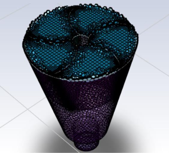 CFDsimulationsgenerallyconsistofthreemainprocesses: pre-processing,solving,andpost-processing.Pre-processing is the stage of creating a rotating fluid domain and a stationaryfluiddomain,aswellasperformingthemeshing process.Themeshtypeusedisthepoly-hexcoretype,which is a combination of a poly and a hexcore mesh. The fluid domainandmeshareshowninFigures2and3.Themesh resultsstatisticsareshowninTable1.