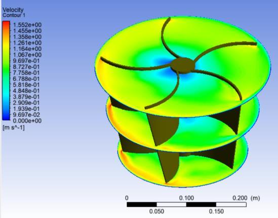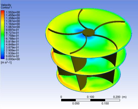 Thefluidpressureandvelocitycontoursaroundtherunner weretakenatthemiddle,top,andbottompositionsofthe runner.Figure5showsthedistributionofpressurecontour results and Figure 6 shows the distribution of velocity contoursaroundtheturbinerunner.Theadditionofadraft tube to the vortex turbine basin outlet channel causes an increase in the flow pressure value around the turbine runner. The increase in flow pressure caused by the lowpressurearea at the basin outletcan be minimized bythe draft tube which causes a change in flow pressure in the turbine basin where the kinetic energy of the flow is converted back into pressure energy by the shape of the draft tube configuration, namely divergent. On the other hand,theadditionofadrafttubecausesthedistributionof lowpressurearoundtherunnerwithoutadrafttubetobe reducedsothattheturbinerunnerismoreevenlyexposed to the vortex flow so that the resulting torque can be increased.
