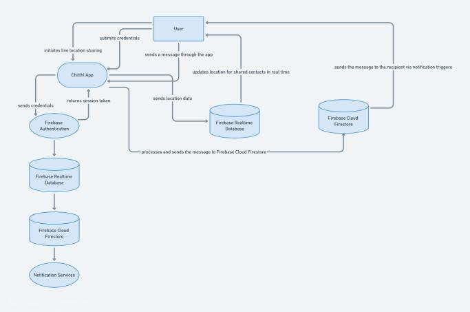 Thefollowingsystemflowdiagramillustratesthesequence ofoperationsandlogicwithintheapplication,emphasizing userinteractionssuchasauthentication(loginviaFirebase authentication), sharing locations, sending messages, processingrequests(validatingrequestsandcommunicating with Firebase), updating Firebase databases, triggering notifications, and providing user feedback through UI updates.