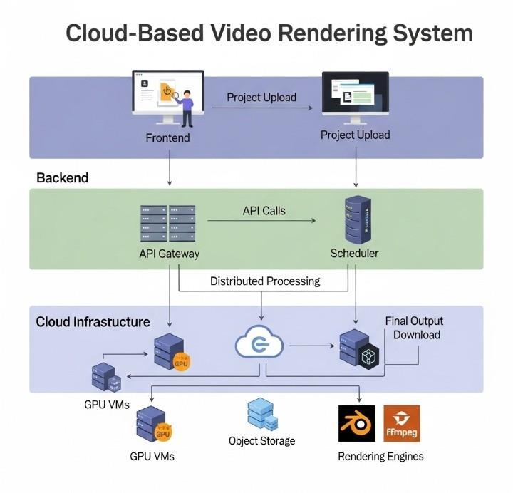 The proposed Cloud-Based Video Rendering System transfers this computational burden from the user’s local system to the cloud. The process starts with the user uploadingtheirprojectfilestoacloudplatformviaasecure webinterface.Theuploadedfilesarestoredincloudstorage (e.g.,AWSS3,GoogleCloudStorage).Ajobschedulerthen breakstherenderingtaskintosmallersegments suchas frame batches or scene partitions and assigns them to multiple GPU-enabled virtual instances. Each instance processes its assigned portion in parallel, drastically reducingtheoverallrenderingtime.Afterallsegmentsare processed, the system merges them into a final video file, compressesitifrequired,andprovidesadownloadlinkto the user. The architecture also includes automatic error handling ifanyinstancefails,theschedulerreassignsits tasktoanotheravailablenode,ensuringfaulttoleranceand reliability.Thesystem’sweb-baseddashboardprovidesrealtimemonitoring,progressvisualization,andcostestimation, makingtheprocesstransparentandefficient.