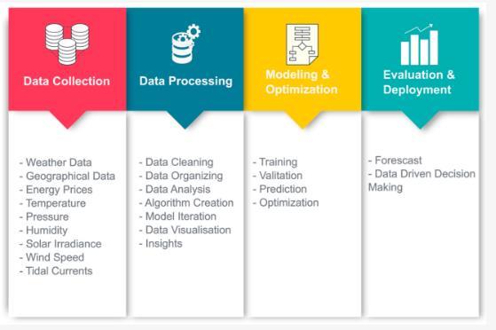 To alleviate the above limitations, Artificial Intelligence (AI) is a tool that has gained a lot of popularity in energy forecasting.Machinelearning(ML)anddeeplearning(DL) aretechniquesthatutilisedata-drivenapproachesthatdo not rely on explicit physical modelling. These systems adapt to changing circumstances by studying data trends tobeevenmoreaccurateandrobust.AccordingtoMosavi et al. (2019), AI methods such as Random Forests, Artificial Neural Networks (ANN), and Gradient Boosting yield better results compared to the classical ones, especially in modeling temporal dependency and nonlinearitiesinrenewableenergyoutputs.