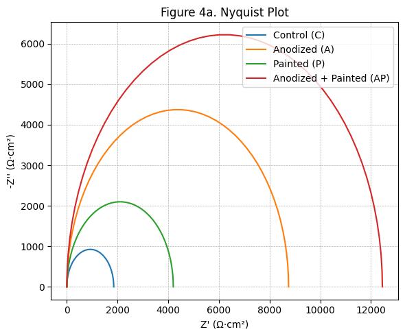 Electrochemicalimpedancespectroscopyresultssupported thepolarizationfindings.Thepolarizationresistancevalues were1,850Ω·cm²forthecontrol,8,750Ω·cm²foranodized, 4,200 Ω·cm² for painted, and 12,450 Ω·cm² for anodizedthen-painted specimens. The coating resistance of the combinedtreatmentwasapproximately3timeshigherthan that of painted-only specimens, highlighting the effectiveness of the anodized underlayer in preventing chlorideingress(ISO,2016;GamryInstruments,n.d.).The Nyquist/Bode behavior expected for high-barrier organic coatings larger semicircle diameter and higher lowfrequency|Z|isconsistentwiththeseR_ptrends(ISO,2016; GamryInstruments,n.d.).