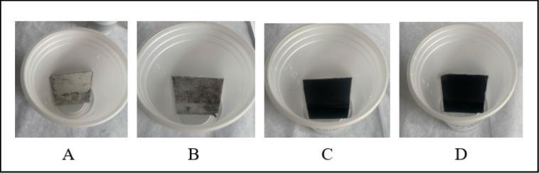 Fig -1:Photographsoftestspecimensbeforeimmersion testing:(a)untreatedcontrol(b)anodizedonly(c)painted onlyand(d)anodizedthenpaintedspecimens.