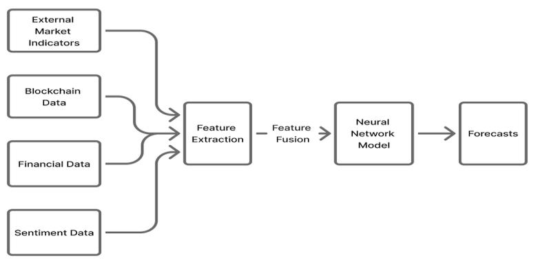 Multiple data streams : blockchain, financial, sentiment, and external market indicators undergo feature extraction and fusion before entering the neural network forpriceforecasting.