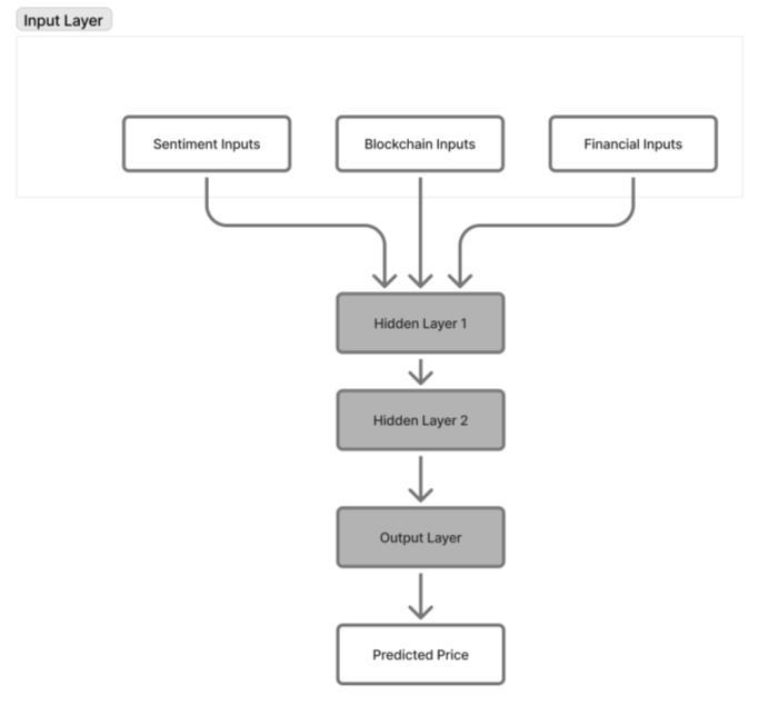 A multi-input ANN framework where financial, blockchain, and sentiment inputs flow into two nonlinear hiddenlayersbeforeproducingthepredictedpriceoutput. This architecture enables the model to approximate nonlinear interactions across heterogeneous cryptocurrencydatasources.