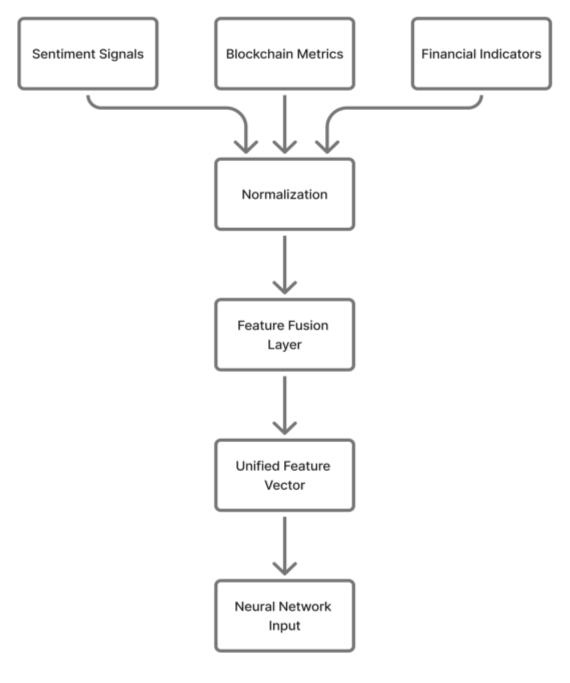 Financial, blockchain, and sentiment indicators are normalized, fused, and transformed into a unified feature vector that serves as input to the neural network model.