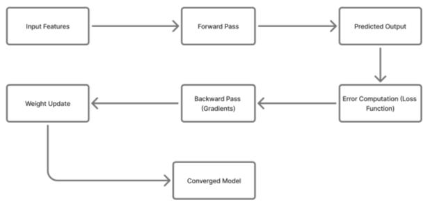 The forward pass computes predicted outputs from input features. The loss function measures error, which is backpropagated through gradients to update network weights iteratively until convergence, forming the optimizedneuralnetworkmodel.