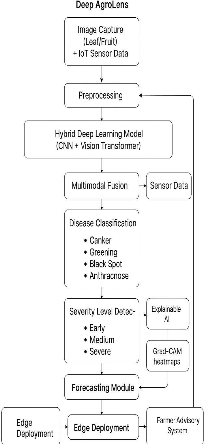 TheDeepAgroLensframeworkaddressesthesethreecoregapsby proposingaholisticarchitecture:ahybridCNN-ViTfor robustfeatureextraction,multimodalfusionforearlydetection,LSTMforprognosis,andoptimizededgedeploymentcoupled withXAIforfieldutility.