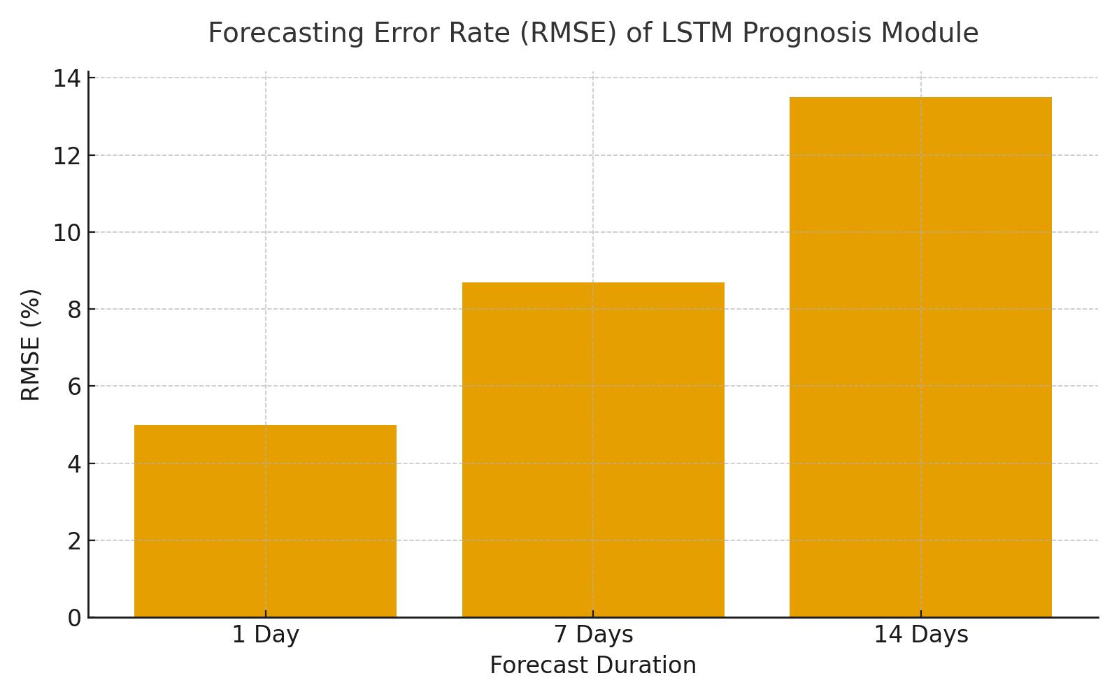 CHART1:FORECASTINGERRORHEREFigure3–ForecastingErrorRate.ThebarchartdemonstratestheRootMeanSquare Error(RMSE)oftheLSTMPrognosisModuleacross1-day,7-day,and14-daypredictionwindows,validatingthestabilityof long-termriskassessment.
