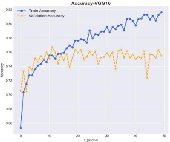 Here, we present the results of VGG16 in means of accuracy, loss, and confusion matrix in the following fig 6,fig7,andfig8.Inthebelowfig6,theaccuracyplotfor VGG16hasbeen presented withaccuracyVsEpochsfor boththetrainaccuracyandvalidationaccuracy.