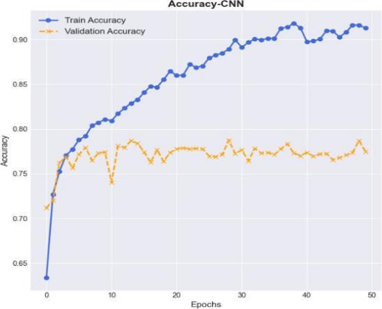 First, we present the results of CNN in means of accuracy, loss, and confusionmatrix in the following fig 3,fig4,andfig5.Inthebelowfig3,theaccuracyplotfor CNN has been presented with accuracy Vs Epochs for boththetrainaccuracyandvalidationaccuracy.
