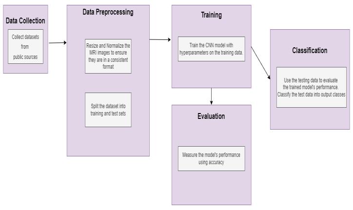 The provided system architecture shows how a algorithm CNNisusedinanMRIimagecategorizationsystem.Thefirst step of the procedure is data collecting, which comprises acquiringMRIpicturesfrom publicallyaccessiblesources.