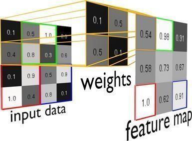 Figure 5. The figure depicts a toy example of a greyscale input image with pixel values between 0 and 1, a weightmatrix (filter) and the resulting feature map. Pre-activations of hidden neuronswithin the feature map are obtained by weightingpixel-values withina 2x2receptivefieldwiththe corresponding weights of the filter and summing up the resultingfourtermsasshowninorange.Toobtainthenext feature map value, the filter is moved across the image with a stride of 1 (e.g., from the orange to the green quadrant). The resulting feature map is a map of where thefeature encodedin thefilterhasoccurred in the input image. Here, the filter corresponds to a diagonalthatresults in astrong pre-acti-vation signal for the green, red and blue filterpositionsovertheinputimage,whichisreflectedinthe featuremapaccordingly.