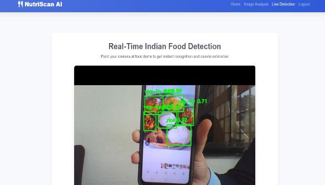 7)Integration with Flask: A simple web-based application was developed using Flask to provide a userfriendly interface for real-time food identification and calorie assessment. Users were able to upload images or stream live input for the food identification service. The backend incorporated trained YOLO and CNN models to return bounding boxes, predicted classes, calorie values, and dietary recommendations. The application included other features including user authentication and result storage to facilitate practical use within a nutritional monitoringcontext.