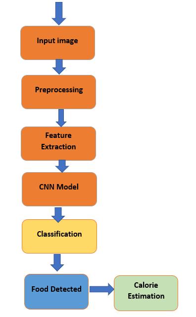 remove noise, along with resizing, reshaping and reformattingforprocessing.Next,theimageisputthrough a feature extraction process to gather visual features deemed essential to food recognition systems. These features are then sent into a CNN model that learns hierarchical representations of the visual features to facilitatefoodclassification.Theclassificationmodulewill generatethefoodlabelwhichwillbechosenfromtheprestudied classes of food items. Finally, the output will go throughacalorieestimationstepwheremappingbetween thevalueofknownnutritionintheidentifieditemwill be calculated to finalize the calorie estimate. This process completes a sustainable workflow where calorie estimation and recognition are bundled together in one pipeline.
