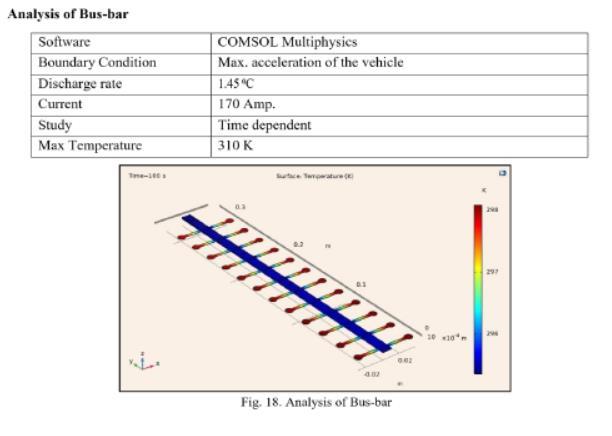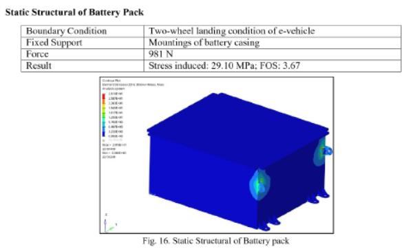 Thestructuralandthermalanalysisofthebatterypackwas conductedusingANSYSforstructuralanalysisandCOMSOL Multiphysicsforthermalanalysisofthebatterypackaswell asthebusbar.Thisanalysisprovidesvaluablefeedbackon the safety and durability of the battery pack. Structural analysisrevealsthemechanicalintegrityofthebatterypack ensuringthatthebatterypackcanwithstandphysicalstress without failure during off-road applications. On the other hand,thermalanalysishighlightsthethermaldistributionin thebatterypackduringoperation.Thisanalysisiscrucialfor identifying hotspots to ensure thermal management and prevent overheating. The thermal analysis of the busbar ensures that the busbar can handle high loads without overheating.Theresultsofthebatterypackareasfollows: