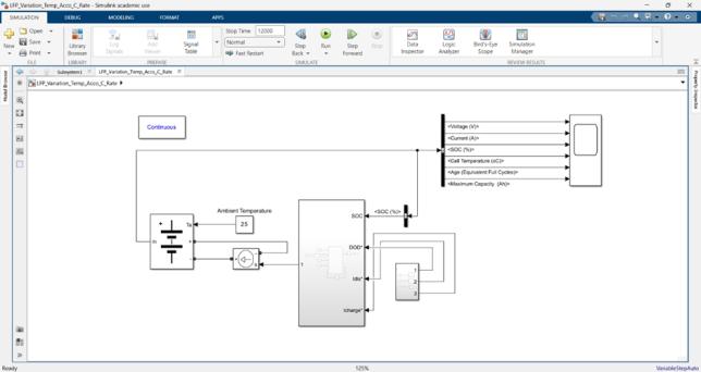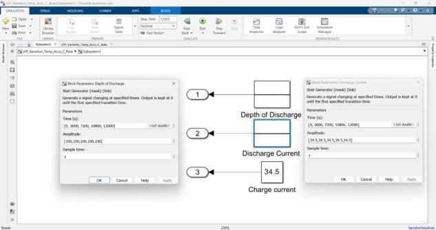 A MATLAB Simulink model was designed to demonstrate variations in cell performance corresponding to C-rate. In thismodel,wehavethecapabilitytoadjustparameterssuch aschargecurrent,dischargecurrentanddepthofdischarge (DOD) over various time intervals. In this simulation, we conductedbothcharginganddischargingcycles.