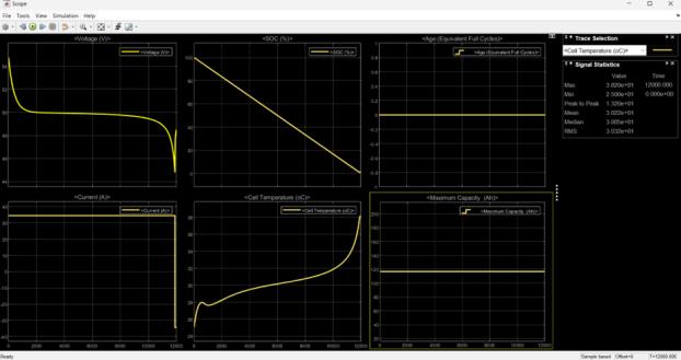 The results generated illustrate the variation in key parameters like current, voltage, state of charge, capacity and cell temperature over time. The voltage curve shows typicalcharginganddischargingcycles,whiletheSOCgraph indicates the amount of charge remaining in the cell. Additionally,thetemperaturegraphindicates thethermal behavior of the cell, which is crucial for understanding its performanceandsafety.