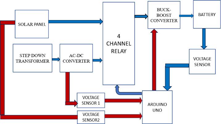 Initially,powerissourcedfromthegridandroutedthrough astep-downtransformertoconvertthe230VACvoltageto 12VAC.Subsequently,a12VACto12VDCconversionis achieved using an AC-DC Converter. A 12 V solar panel is employed,withaboostconverterenhancingthevoltageto 24Vwhennecessary.Outputsfromboththesolarpaneland the step-down transformer are directed to a four-channel relay.Therelayinterfaceswithavoltageandcurrentsensing circuit, as well as an Arduino Nano for regulation and control. The relay selects the best power source that is available and disables another source. The relay output is connectedtovoltagevoltage-sensingcircuittomeasureand modifythevoltage.Theoutputfromthefour-channelrelayis connected to the cascaded buck-boost converter, which bucksorboostautomaticallythevoltageifthevoltagelevel decreasesorincreasesfromthesolarpanelorgridmakingit constant and preventing it from varying. The converter is connectedtothebatterywhichchargesfromthecascaded converterandithasavoltagesensortocheckiftherequired voltage is achieved. The Arduino governs the circuit operationsandinitiatesthesignalingprocess.Adedicated circuit for voltage and current sensing measures these parametersfrombothsourcesfordisplaypurposes.Utilizing Arduinocode,thesystemselectsthepowersourcewiththe highervoltage.Valuescanbemonitoredviaaserialmonitor oranLCD.Theoutputvoltagereceivedcanbeusedtocharge theloadthroughthebattery.