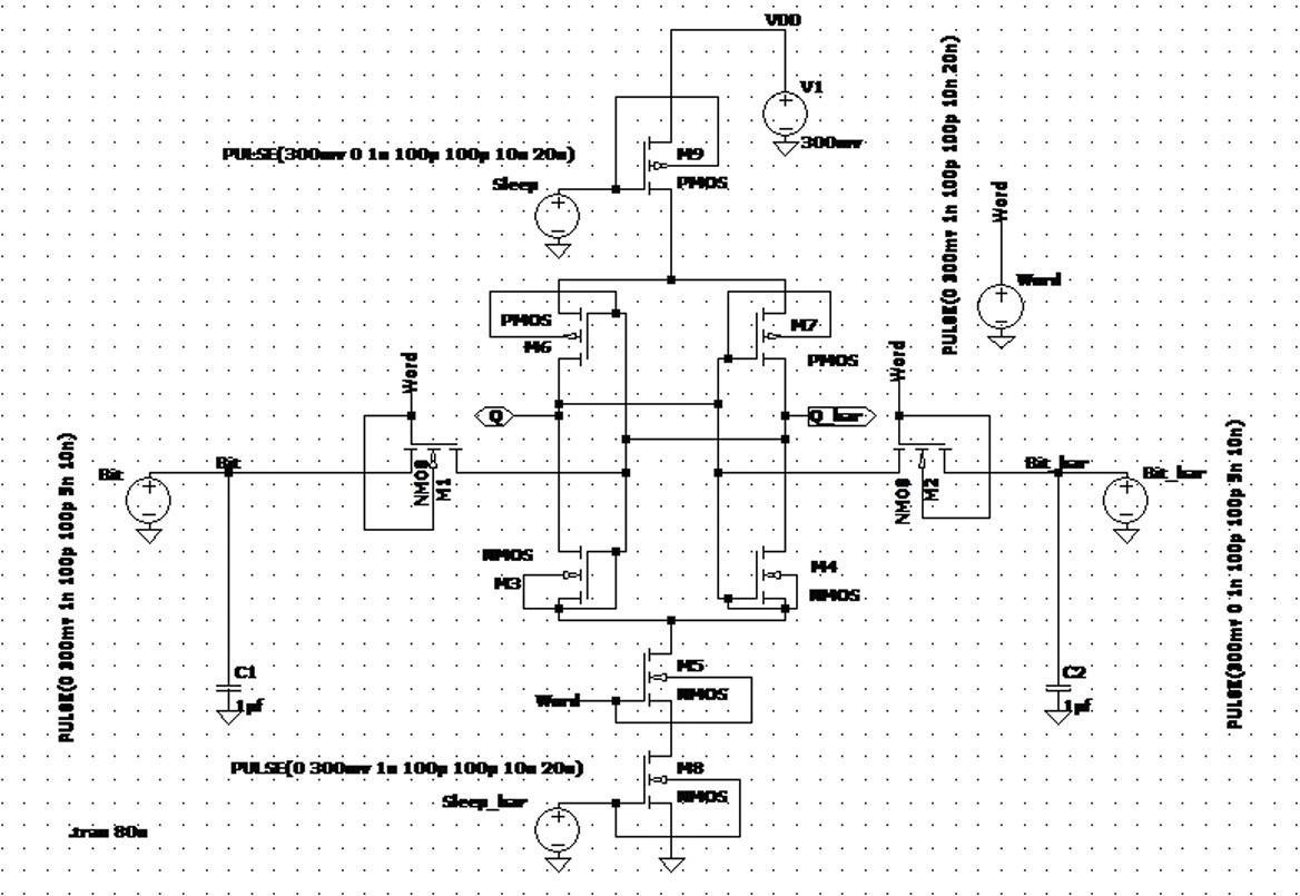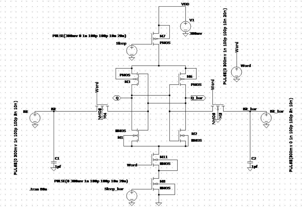 Figure2:7TSRAMwithSleepTransistor(MTCMOS)showinghigh-Vth PMOSheaderswitchforpowergating.Sleepsignal controlssupplydisconnectionduringstandbymode.W/L(SLEEP)=360nm/90nmforlowON-resistance.