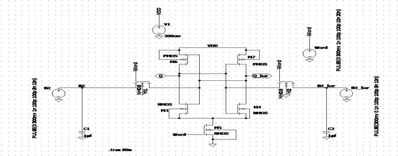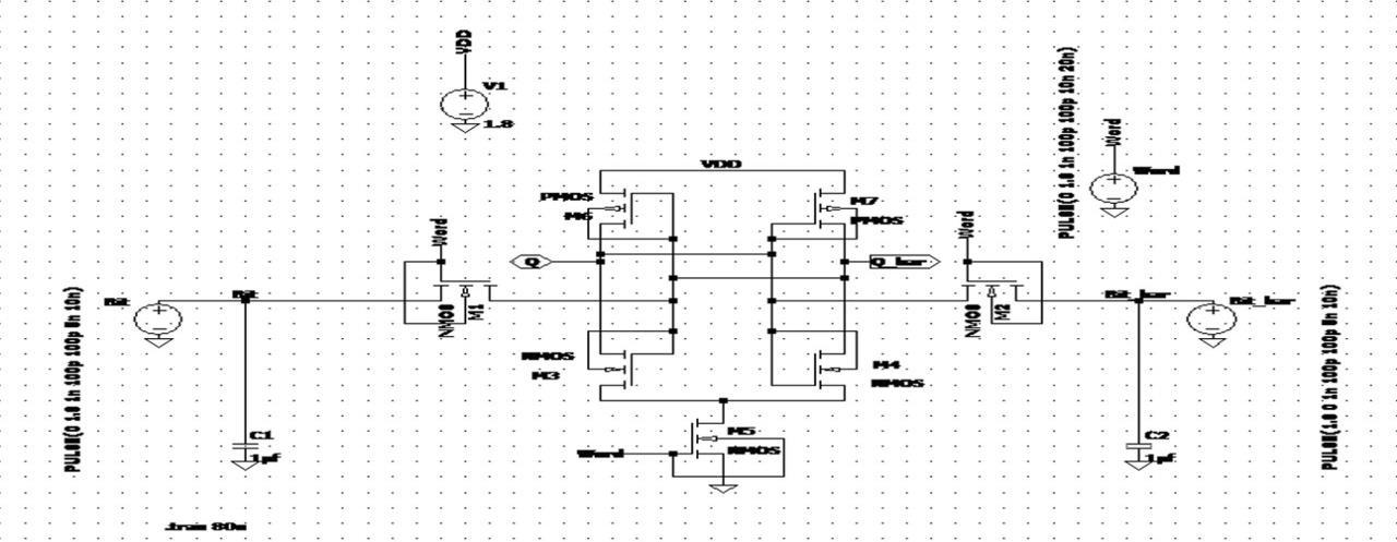 Figure1:Basic7TSRAMcellschematicshowingcross-coupledinverterlatch,accesstransistors(M5,M6),andground controltransistor(M7)forimprovedreadstability. Transistorsizing: PMOSW/L=180nm/90nm,NMOSW/L= 90nm/90nm.