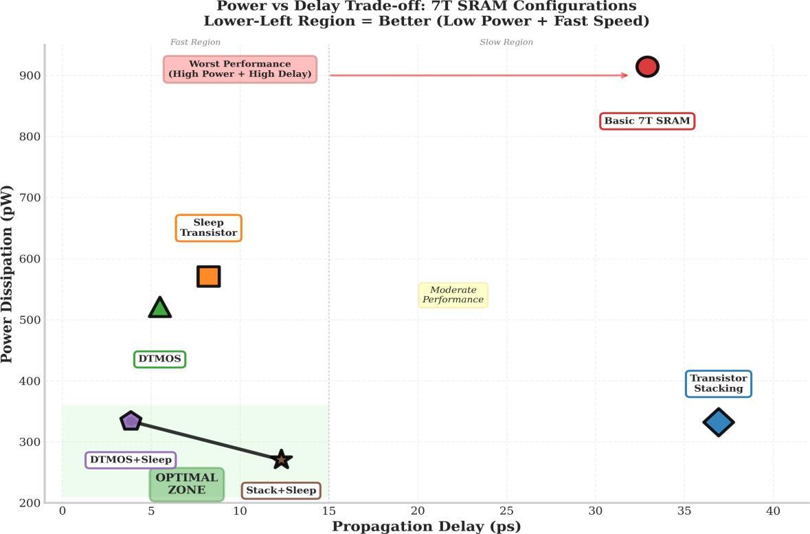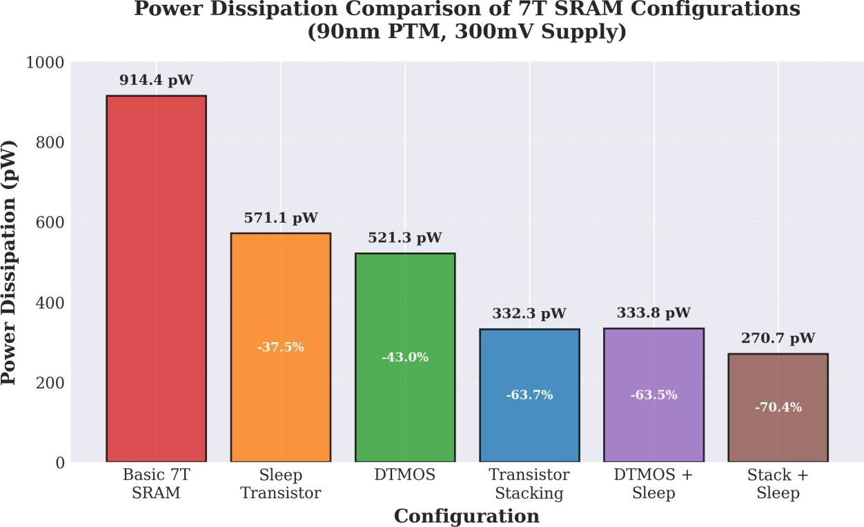 In conclusion, this comprehensive study establishes hybrid power reduction techniques particularly DTMOS with Sleep Transistor as optimal approach for 7T SRAM cells requiring balanced power-performance characteristics, providingquantifiedevidenceandpracticaldesignframeworkforlow-powermemorysystemarchitects.