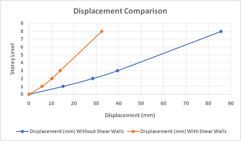 Assessment of displacement table comparing results with and without shear walls at different story levels is given below.