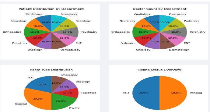 Graphical Results Visualization: Uses Matplotlib to produce bar charts, pie charts, and statistical summaries.Visualdashboardspresenttrendsinpatient visits,departmentalloads,andfinancialperformance.