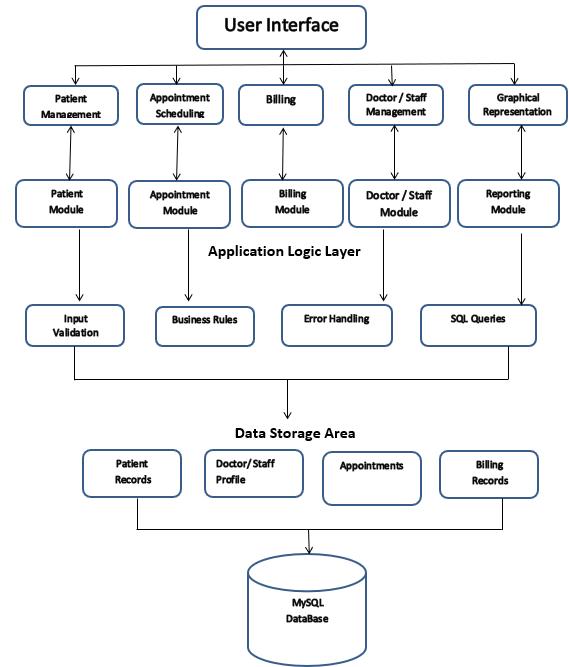 PresentationLayer:DevelopedusingPython'sTkinter library, this layer provides hospital staff with forms, tables, and dashboards to interact with system functionalitiessuchaspatientregistration,appointment booking,andbilling.