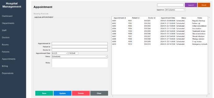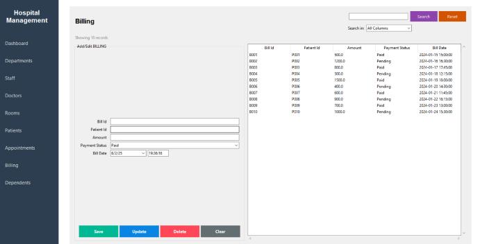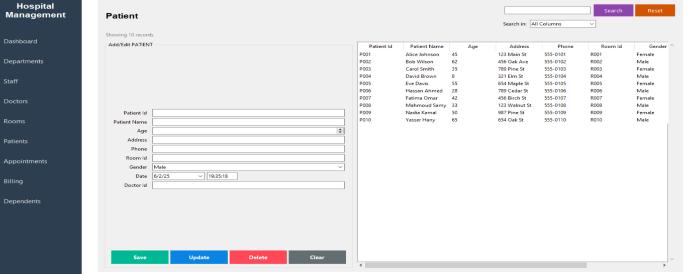 A significant milestone was the integration of graphical reportingusingMatplotlib,whichallowedadministratorsto visualize patient trends, billing summaries, and departmental distributions. The user interface, developed with Tkinter, was designed to be intuitive and efficient, enabling hospital staff to navigate modules with minimal training.Throughoutdevelopment,astrongemphasiswas placed on maintaining data integrity through a wellstructured relational database schema, while ensuring modularity to facilitate independent testing and maintenance.