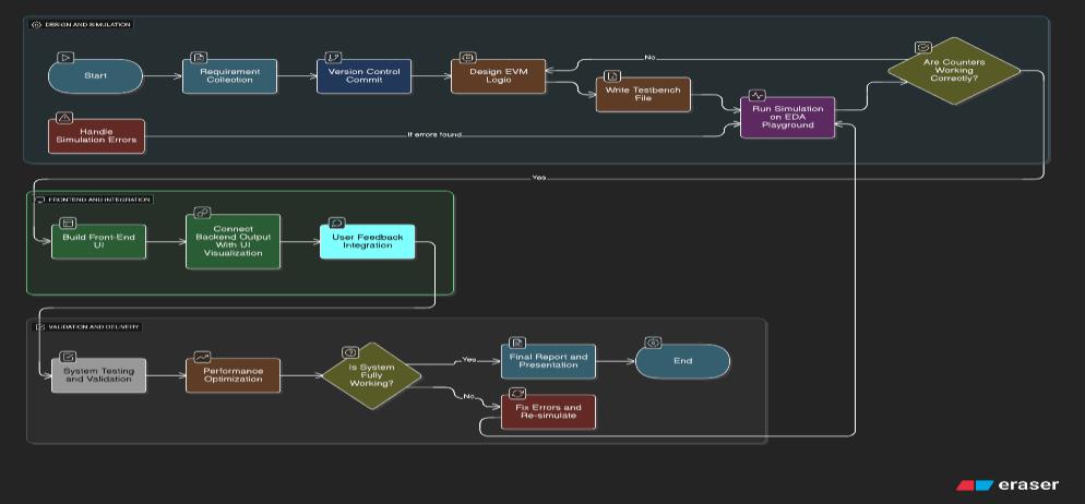 However, commercial government EVMs are highly secure and closed systems, making them unsuitable for academic and educational purposes. Students studying electronics, digital design, or VLSI often need a simplified and practical model to understand how an EVM works internally howthesignalfromabuttonpressisprocessed, how noise or switch bounce is removed, how votes are stored,andhowresultsarecalculated.Existingeducational models are often limited to block diagrams or theoretical explanations and do not provide real-time interaction or visualization.