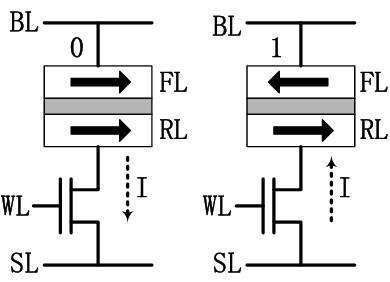 The "1T-1MTJ" structure, whichincludes one transistor and one magnetic tunnel junction with a tunneling oxide layer sandwiched between two ferromagnetic layers, is a widely used cell structure in Spin-Transfer Torque Magnetoresistive Random-Access Memory (STT-MRAM), as depicted in Fig. No. 3. In this structure, the "Reference layer" (RL) has a fixed magnetization, while the "Free layer" (FL) can have one of two potential magnetization orientationstorepresentbinarydata.[11]