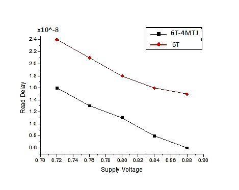 The read delay is defined as the time interval from the activationofthewordlinetothemomenttheoutputnode transitions- either rising for a "1" read or falling for a "0" read.The6T-4MTJcellimprovestheswitchingtimeofthe read operation, as it eliminates the need for additional voltage to initiate the cell, resulting in faster performance (Fig-7).