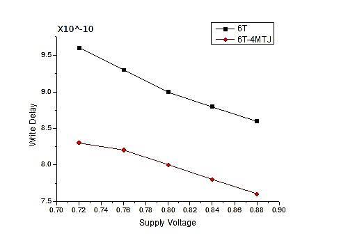 The write delay is defined as the time interval from the activation of the word line to the point when new data is writtentothebitcell nodes. Thedifferenceinwritedelay betweenthe10T(6T-4MTJ)andconventional6TSRAMbit cells is negligible, as the dimensions of the pull-up and access devices, which primarily dictate the write delay, remain identical in both configurations. However, the 6T4MTJ cell enhances the write operation speed due to its switching time, as it eliminates the need for an additional voltagetoactivatethecell(Fig.No.10).