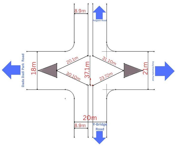 We selected the Rajendra Park chowk or intersectionasa roundaboutareabecauseoftheirbusiesttrafficvolume.The selectedarea isfourlegged junctionthatisfourroadsare joining and the roads are pulgaon road, durg - dhamdha road,dadadadiparkroadandYbridgeroad.