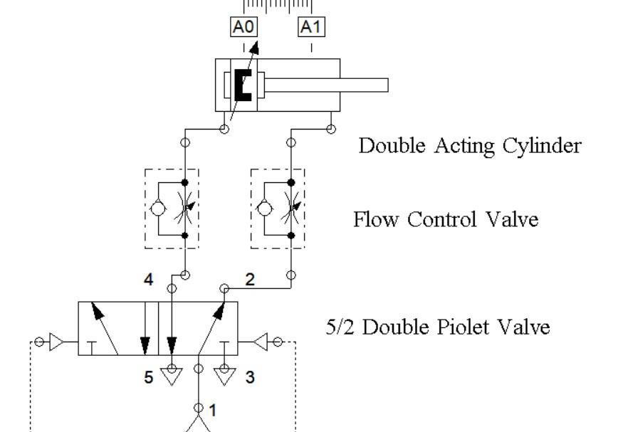 5/2 Double Piolet valve used for actuating double acting cylinder. Flow control valve used to control flow of compressedairintocylinder.