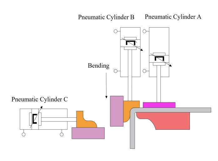 Metalstripisbendusingabendingmachine,wheretheyare placedmanuallyinafixture.CylinderAclampthemetalstrip whenapushbuttonispressed.CylinderBstartthebending operation and retract, and cylinder C completes the operation. After cylinder C returns to its initial position cylinderAreleasesthepart. Operationhastoperform