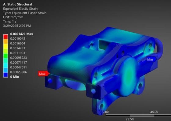 Atransientthermalanalysisonabrakecaliperassesseshow it responds to changes in temperature over time. This involves simulating scenarios where the caliper heats up during braking and cools down during rest periods. By modeling factors like material properties, heat generation frombraking,andheatdissipationthroughconvection,the analysis predicts temperature distributions within the caliper.