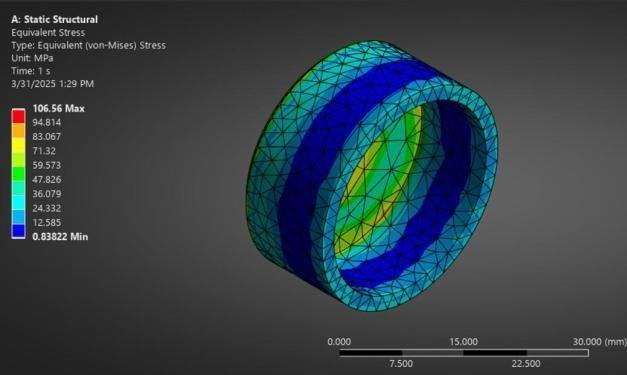 Finite Element Analysis (FEA) on a brake piston involves modellingitsgeometryandmaterialpropertiestosimulate its behaviour under various loading conditions, such as hydraulicpressureduringbraking.FEAhelpspredictstress distribution,deformation,andpotentialfailurepoints,aiding indesignoptimizationfordurabilityandperformance