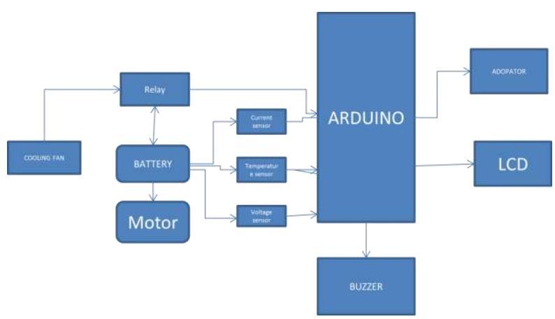 TheblockdiagramasshowninFigure1,representsthe Development of a Battery Management and Fire Safety SolutionforElectricVehiclesusingArduinoATmega328and varioussensors.AtthecenterofthesystemistheArduino, whichactsasthemaincontroller.Batterypowersthemotor andismonitoredcontinuouslybythreesensors:ACurrent Sensor measures the charging and discharging current. A Temperature Sensor (likely DHT11) checks for abnormal risesintemperature.AVoltageSensormonitorsthebattery voltage to prevent overcharging or deep discharging. The Arduino receives data from all these sensors and makes decisionsinrealtime:Ifanyparameterexceedsthesafelimit (e.g.,hightemperatureorovercurrent),theArduinotriggers aRelay.TheRelaycandisconnectthebatteryfromthemotor and simultaneously activate a Cooling Fan to reduce the temperatureandpreventthermalrunaway.Additionally,the ArduinocommunicateswithaBuzzer,whichsoundsanalarm toalertuserstopotentialhazards.Thesystemalsodisplays real-timebatterystatus(voltage,temperature,current)onan LCD screen for easy monitoring. Power is supplied to the ArduinothroughanAdaptor.