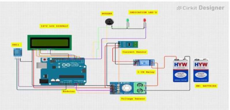Thecircuitshownina Figure4 isaBatteryManagement SystemandFireSafetySystemdesignedusingArduinoUNO and several sensors, built in Cirkit Designer software. The main components include a DHT11 temperature and humidity sensor, a current sensor, a voltage sensor, a 1channelrelaymodule,a16x2LCDdisplay,abuzzer,andtwo indicatorLEDs(redandgreen).Two9Vbatteriesareusedas thepowersource.TheArduinoreadsreal-timedatafromthe voltage sensor to monitor battery voltage and from the currentsensortomonitorloadcurrent.Simultaneously,the DHT11sensormonitorsambienttemperatureandhumidity. ThesystemdisplaysallmeasuredvaluesontheLCDscreen. Under normal conditions, the green LED remains ON,