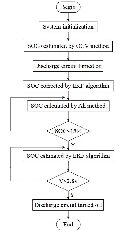 TheflowchartasshowninFigure2,outlinestheprocess forestimatingandmanagingtheStateofCharge(SOC)ofa batterysystem.Initially,thesystemundergoesinitialization whereallcomponentsandparametersareset.ThefirstSOC value (SOC₀) is estimated using the Open Circuit Voltage (OCV) method, which involves measuring the battery’s voltage at rest. Once the initial estimation iscomplete, the discharge circuit is turned on to allow the battery to discharge.Toimproveaccuracy,theSOCiscorrectedusing theExtendedKalmanFilter(EKF)algorithm,whichaccounts fornoiseandsystemvariations.Asthebatterydischarges,the SOC is continuously updated using the Ampere-hour (Ah) countingmethod,trackingtheamountofenergyused.The system then checks whether the SOC has dropped below 15%. If it has, the SOC is re-estimated using the EKF algorithm to ensure better accuracy at low charge levels. Followingthis,thebatteryvoltageismonitored,andifitfalls below 2.8V, the system turns off the discharge circuit to prevent battery damage. The process then ends after ensuringthatthebatteryoperatessafelywithinitslimits.
