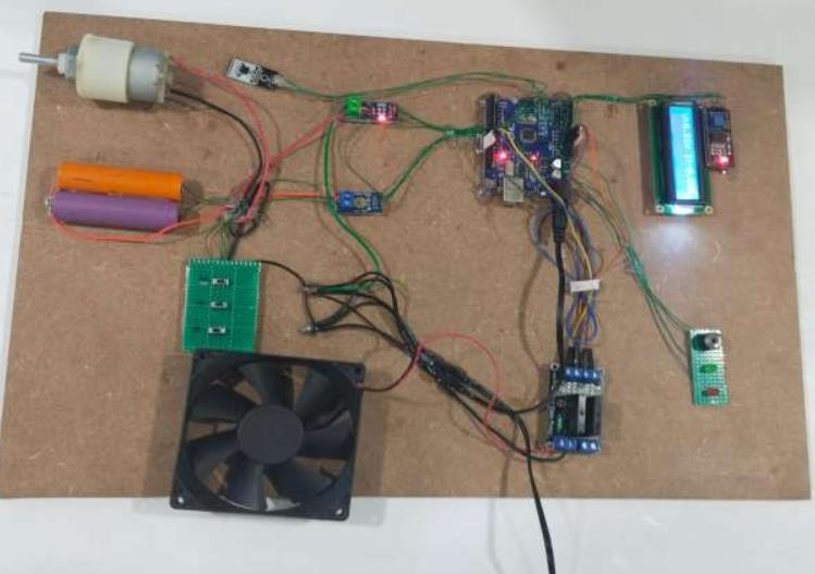 AnArduinoreceivesdatafromthesensorsinrealtime, analyzesit,andthenshowstheresultsonanLCDscreenfor convenient viewing. In response to data collected by the sensors, an external relay module is wired to operate the motor and cooling fan. The system's fan will turn on automaticallytoreducetemperatureifitbecomestoohot. Thetechnologyisdesignedtoimmediatelyinformusersby buzzerifhazardoussituationsaredetectedandcontinue.To illustratehowtheBMSandfiresafetydeviceswouldoperate in an actual electric vehicle, the entire assembly is placed neatlyonawoodenfoundation.Thedesignguaranteesthat electricvehiclesaresafe,reliable,andhaveeffectivebattery management.