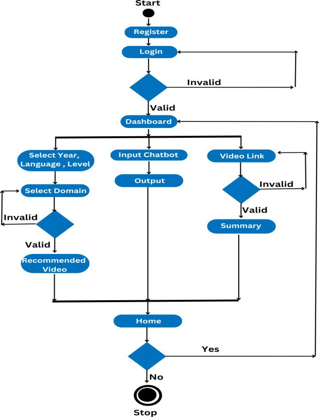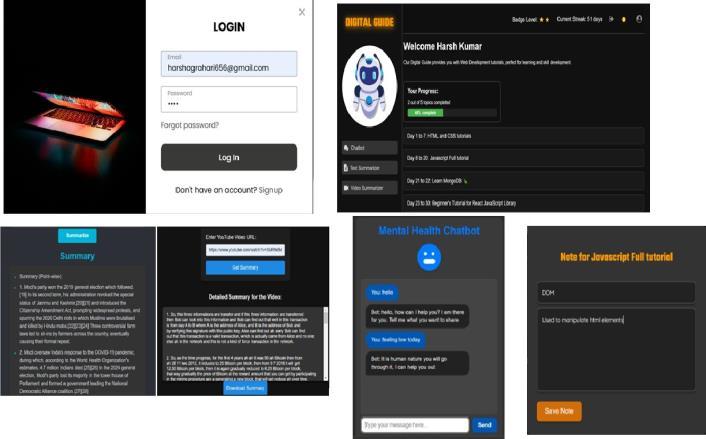 3. Dashboard Module provides users with personalized content according to their requirements. Provides users with the core functionalitiesofthewebapplicationsuchasvideo content,notemaking,chatbot,textsummarizerand videosummarizer.